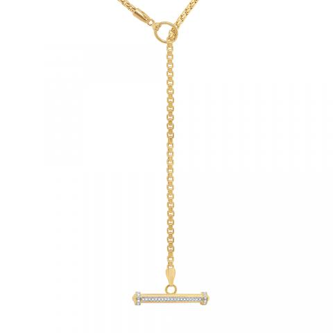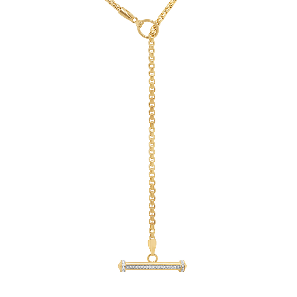 Two ways to wear! As a long continuous necklac (with the clasp in front or back) or as a lariat. Diamond accents on the gold bar add just the right amount of sparkle.
