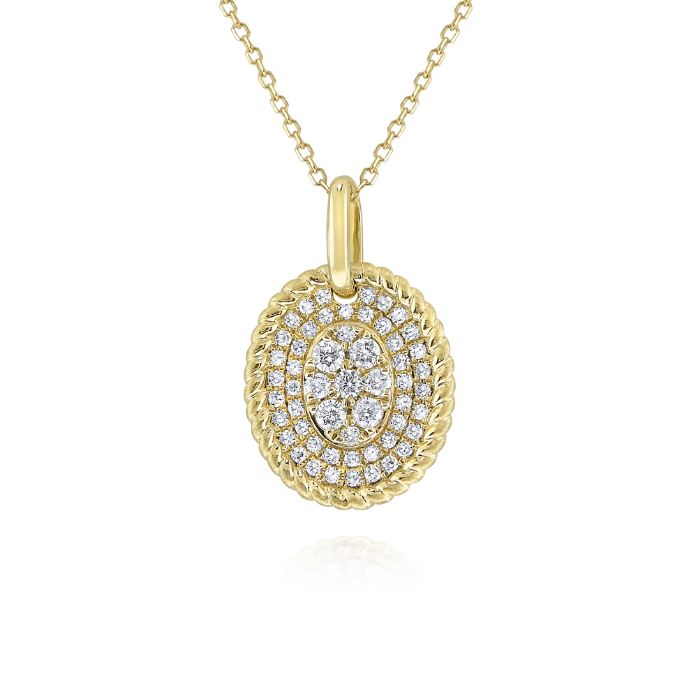 Diamonds are set in concentric ovals and framed with a delicate rope design for a simple classic look.