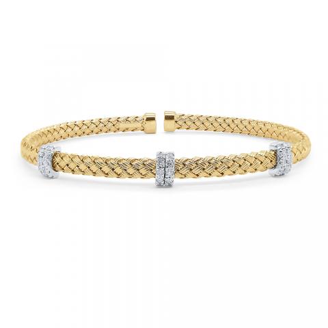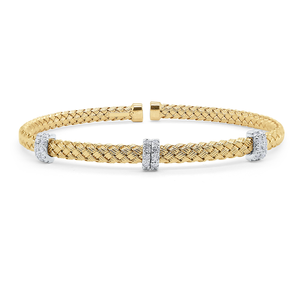 A beautiful golden woven texture is accented by pave diamonds in this bangle design that the is perfect addition to your stackable bracelet collection.