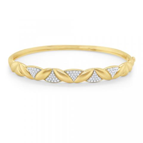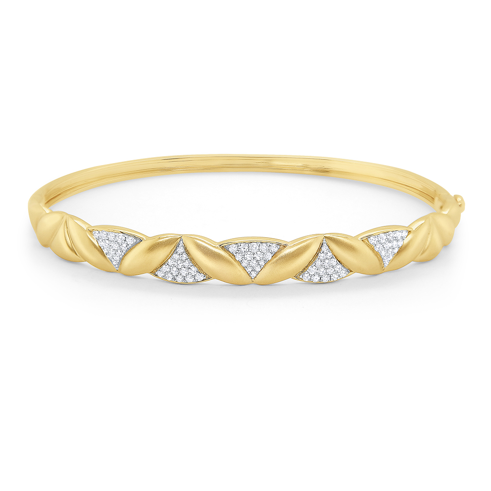 Pillow like leaf shapes alternate with diamond trumpet shapes making up this spectacular bangle bracelet.