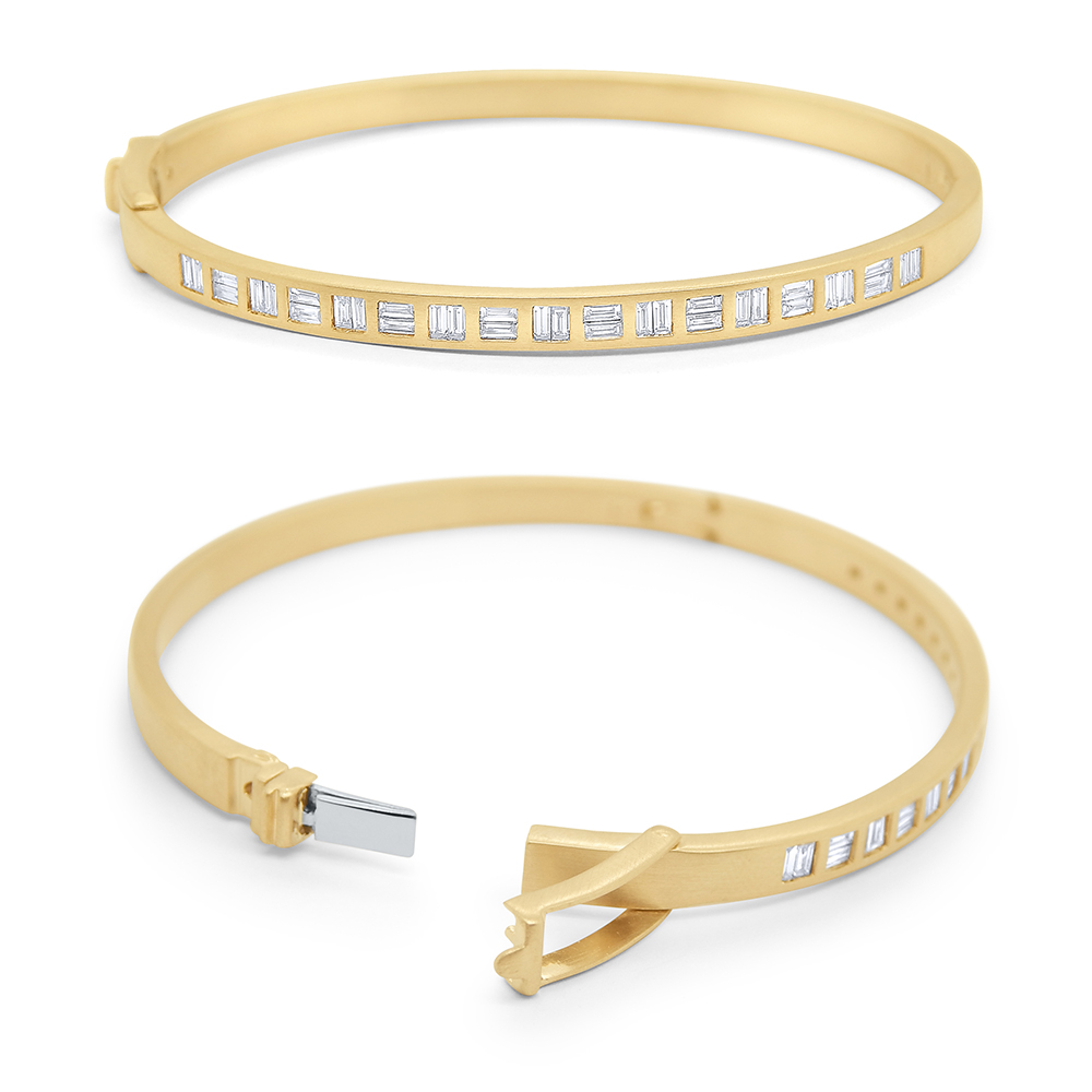 34 dazzling baguettes form this modern gold bangle. Wear solo or stack with our other baguette bangle B5283.