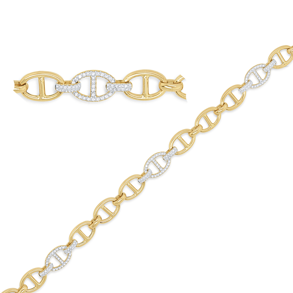 Diamond pave mariner links are set between polished gold links to create this stunning bold bracelet.