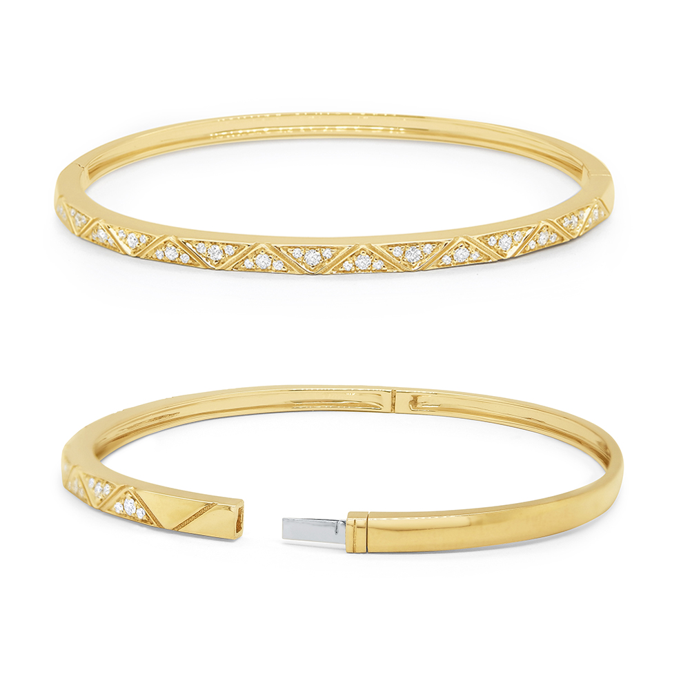 Diamonds set in alternating triangles shimmer in this modern geometric bangle. Stack in various gold colors to make a sparkling statement.