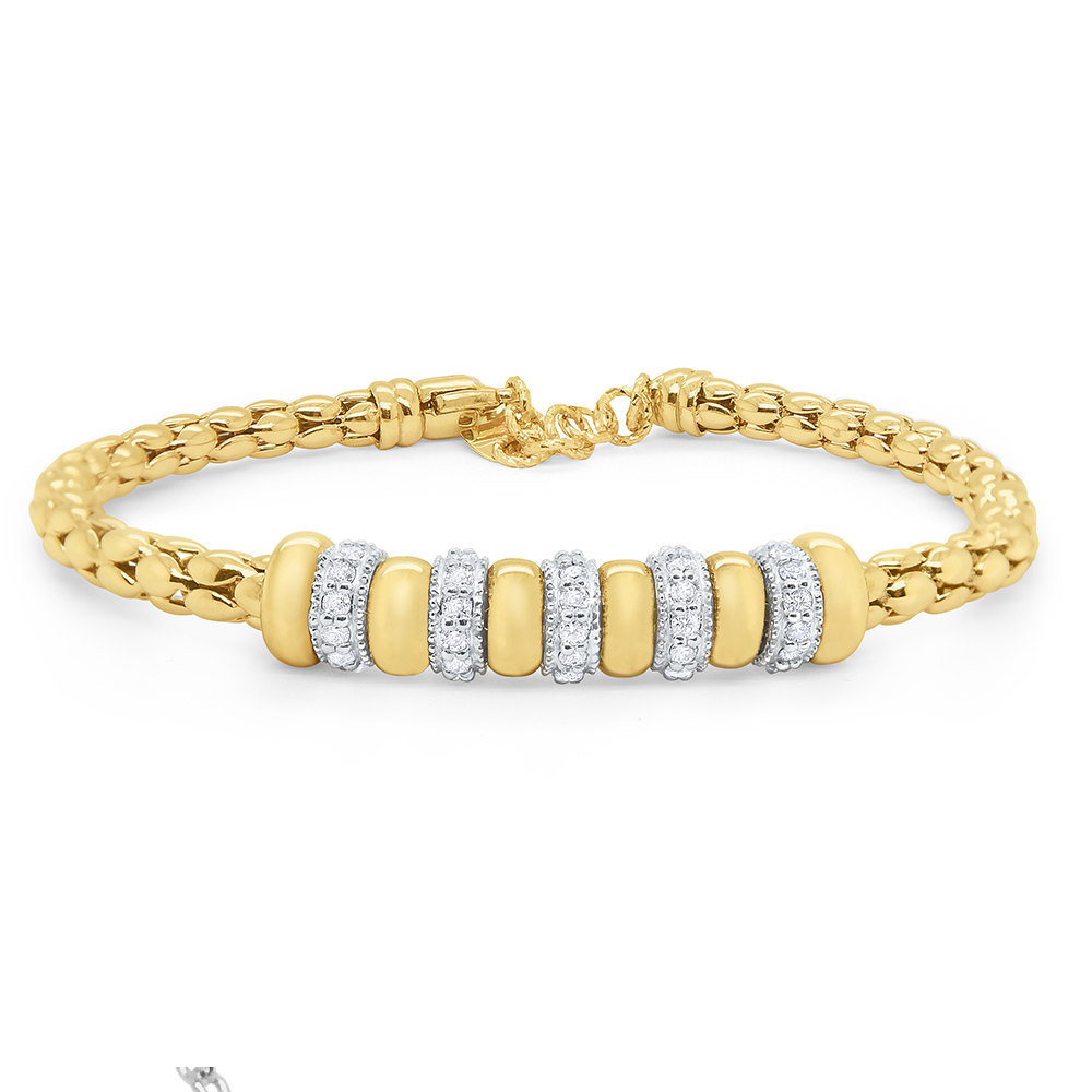 Gold and diamond rondels alternate on a flexible and adjustable textured bracelet.