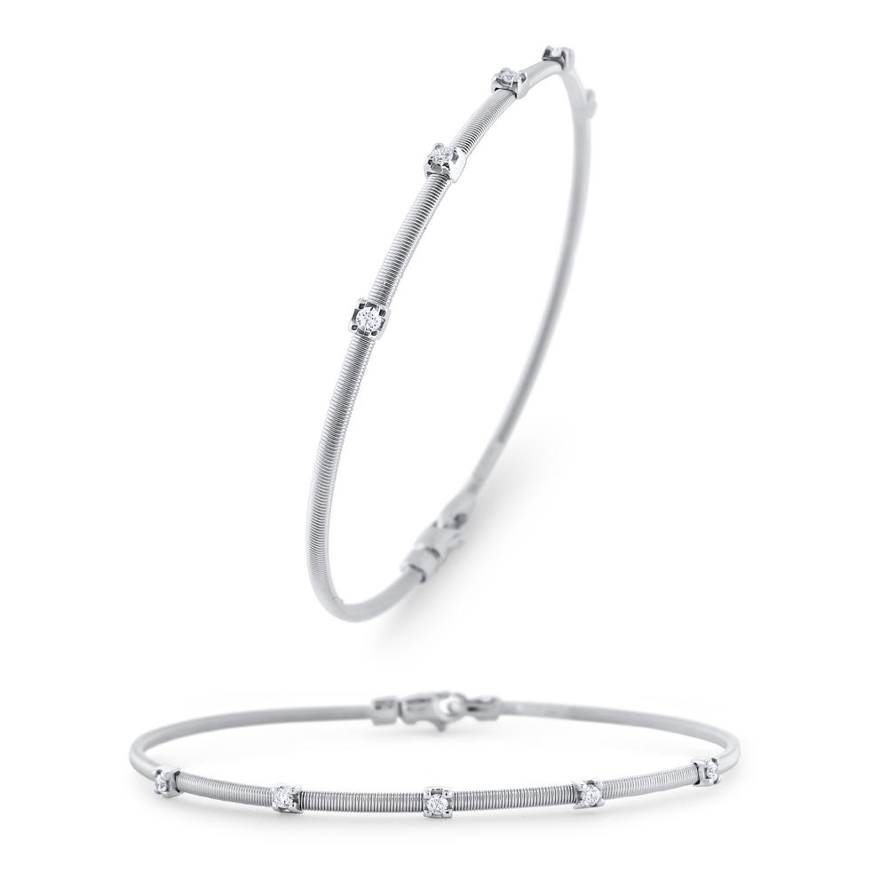 Five prong set diamonds finely detail this fashion forward flexible bracelet. This lightweight piece adds an elegant touch to your everyday arm party.