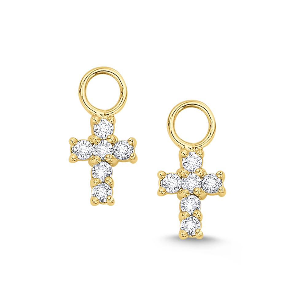 These diamond cross earring charms are a stylish and creative way to show your faith. They contain 12 beautiful and sparkling .30 ct tw diamonds that catch the light and sparkle in a charming and elegant way. Make a fashion statement that is close to your heart with these gorgeous diamond cross earring charms.