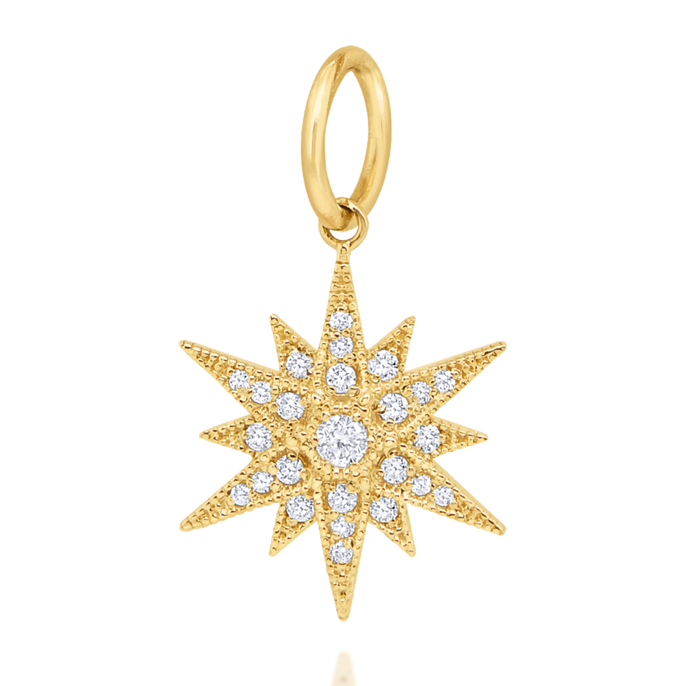 This 12 pointed diamond starburst charm is set with 19 sparkling diamonds. Wear solo or stack with your other celestial charms.