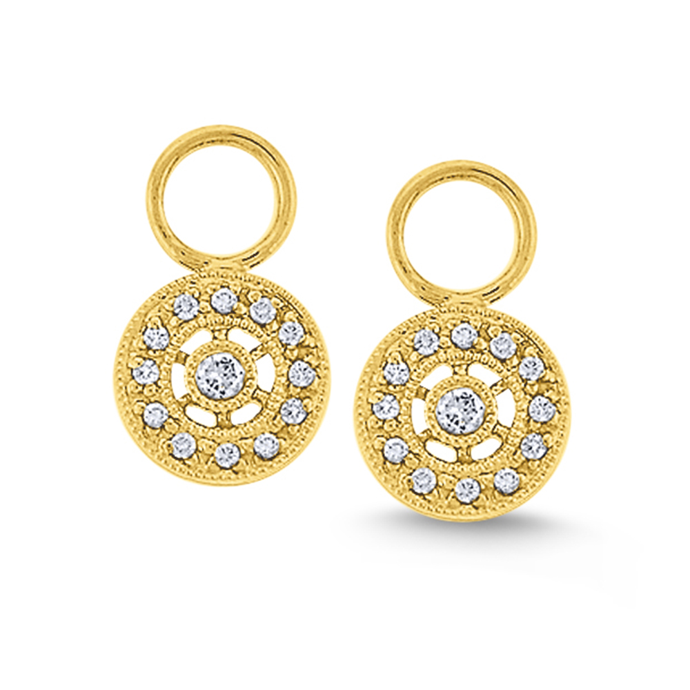 These charming diamond circle drop earring charms are a simple and elegant shape, but upon closer examination they reveal their multi-faceted shimmering complexity. These fascinating and stylish earrings are finely crafted of the best quality materials and exquisitely detailed, with 26 gleaming .14 ct tw diamonds in a detailed and ornate pattern.