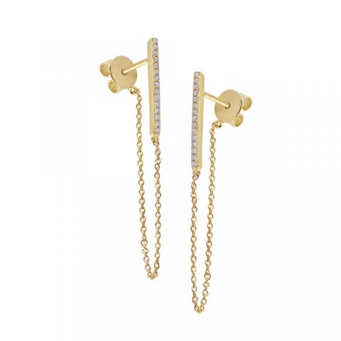 A simple gold and diamond bar are linked to a chain that sweeps under and behind the ear. You'll never worry that you will loose back to these!