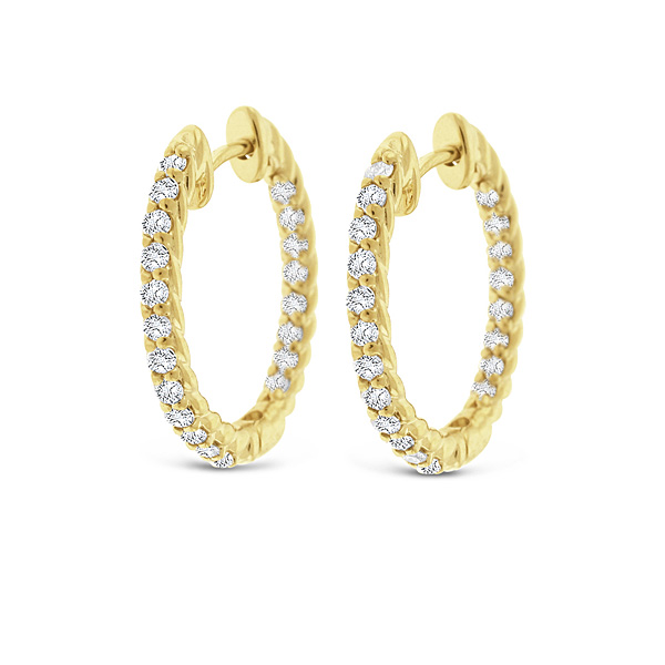 When you add double the diamonds, you get double the glamour and double the style! These diamond inside outside hoop earrings contain 40 shimmering .60 ct tw diamonds on the inside and the outside of the hoops for a bold look with serious impact. These unforgettably beautiful earrings are shown here in yellow gold.