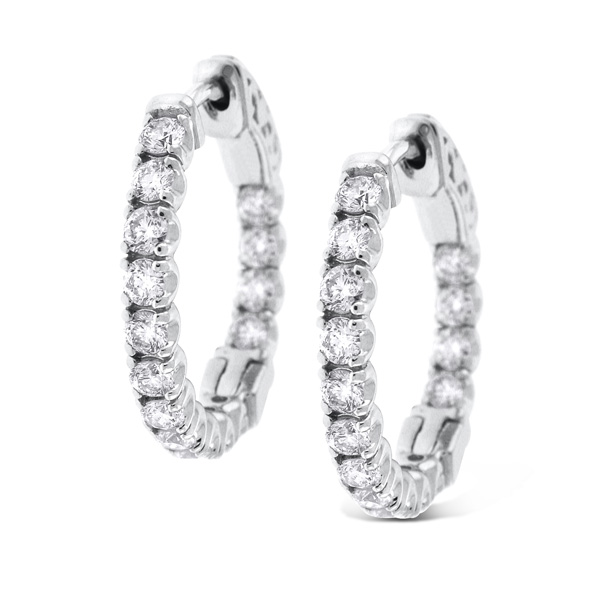 Make a statement and sparkle from every angle with these beautiful diamond inside out hoop earrings. The diamond hoops shown here, include 30 twinkling diamonds, weighing 1.54ct tw, hand set on both the outside and inside of the 14K white gold hoop so they will shine bright and dazzle in all occasions. These can be worn as everyday earrings or for special occasions, making them a fast favorite that will make a bold and lasting impression. Make this the perfect gift or treat yourself to these dazzling diamond hoop earrings.