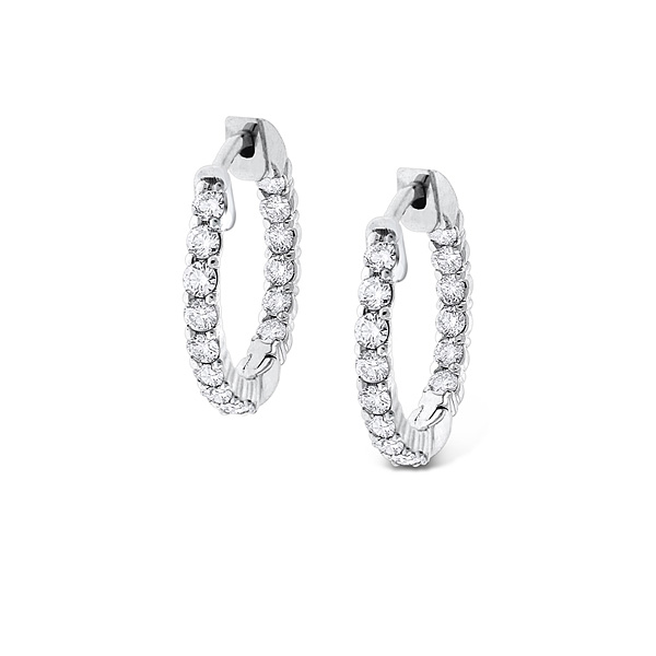 These diamond inside outside hoop earrings, speak for themselves. They are classy and elegant and don't take center stage, yet they will add an air of refined sophistication to any outfit and be the perfect accessory for your next evening soiree. They contain 30 glimmering .90 ct tw diamonds and are shown here in white gold.