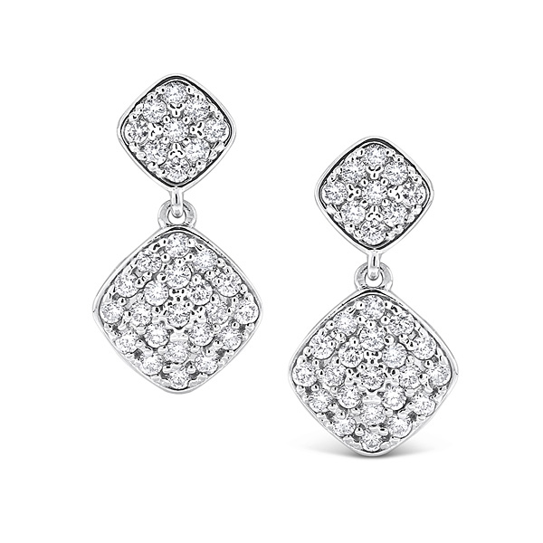 Diamond Double Cushion Drop Earrings in 14k White Gold with 60 Diamonds weighing 1.15ct tw