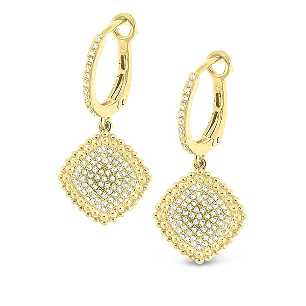 Geometric shapes always look chic and modern and these diamond square drop earrings will make a bold impression. Although their shape is stylish and trendy, their 160 glittery .40 ct tw diamonds give them that sophisticated sparkle and make them elegant and timeless. They are pictured here in yellow gold.