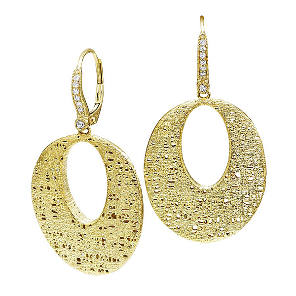 The classic shape of the oval earring has been updated with this beautiful and original design. Aria collection diamond oval earrings shimmer and shine with 14 beautiful .10 ct tw diamonds and are shown here in yellow gold. They are a stylish and beautiful art piece that sparkles with elegance and charm.