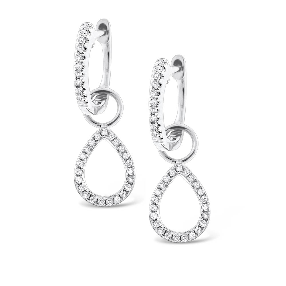 If a pear shaped jewel is said to be a symbol of simplicity and purity, then these diamond mini hoops with pear shape drop charm earrings are the epitome of uncomplicated. Set in 14K white gold with 68 lustrous diamonds weighing .20ct tw, these cute trinkets are full of charm. You can easily wear them with a sundress or a pair of slacks����������������they are perfect in any setting.