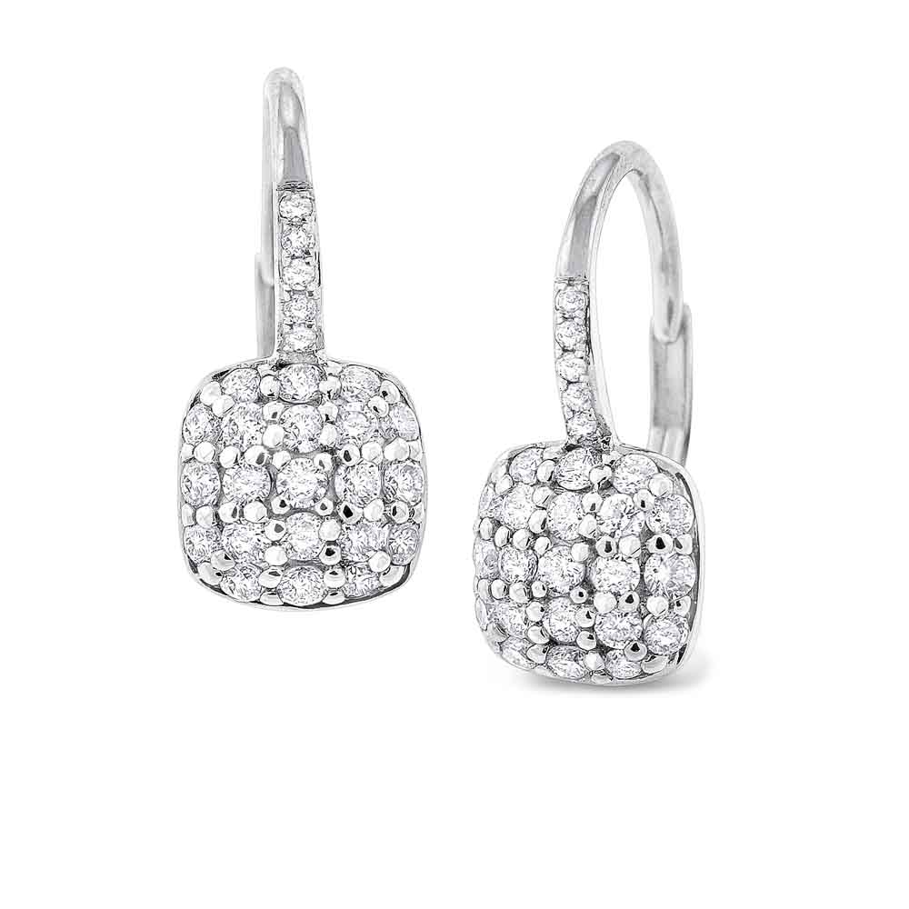 These striking diamond pave cushion shape earrings can brighten up anyones day. Set 14K white gold with 52 gleaming diamonds weighing .56ct tw, this pair will turn many heads. Just slip these on, add a little lipstick and you are sure to have a grand old time.