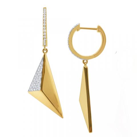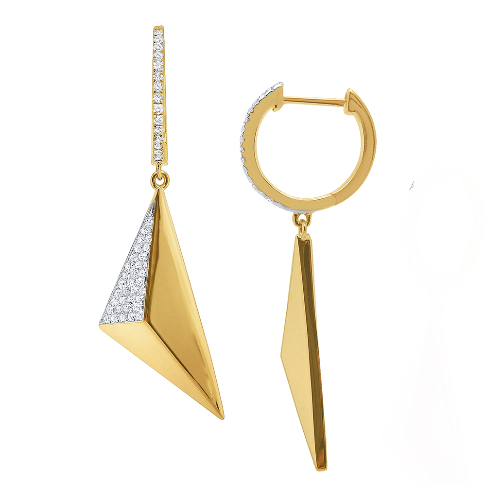 Golden pyramid shapes accented with 98 sparkling diamonds dangle below diamond mini hoops.