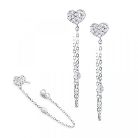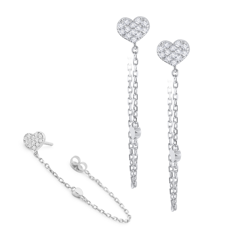 A diamond heart stud anchors a beautifully crafted chain including a single gold stationed heart adorned on each.