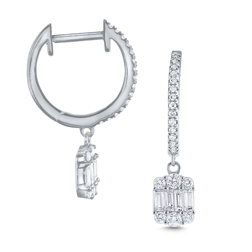 Round and baguette diamonds dangle elegantly in a cluster below small diamond hoops for simple everyday sparkle.