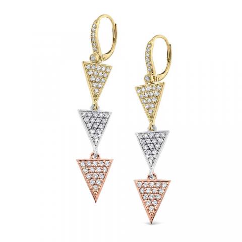 If you are a fan of tricolor gold and are looking for a classy pair of hanging earrings, check out these amazing diamond triple triangle earrings. Magnificently set in in 14K white, rose and yellow gold with 104 sparkling diamonds weighing 1.00ct tw, these charming earrings will make your day. Wear them to work or to a party���������¯���¿���½���������¯���¿���½���������¯���¿���½���������¯���¿���½either way they will complement your wardrobe.