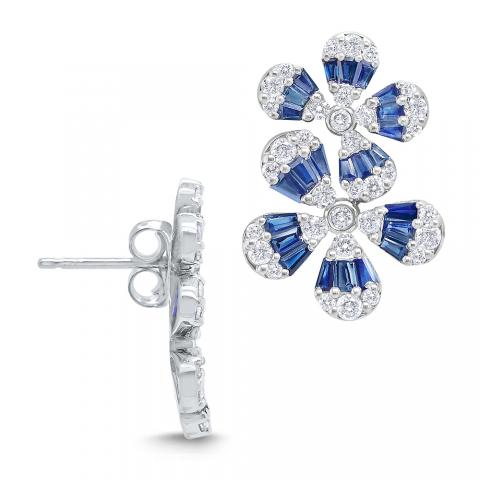 Blue sapphires and diamonds dazzle in these double flower 14k gold earrings. The perfect accessory for spring.