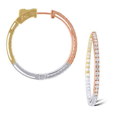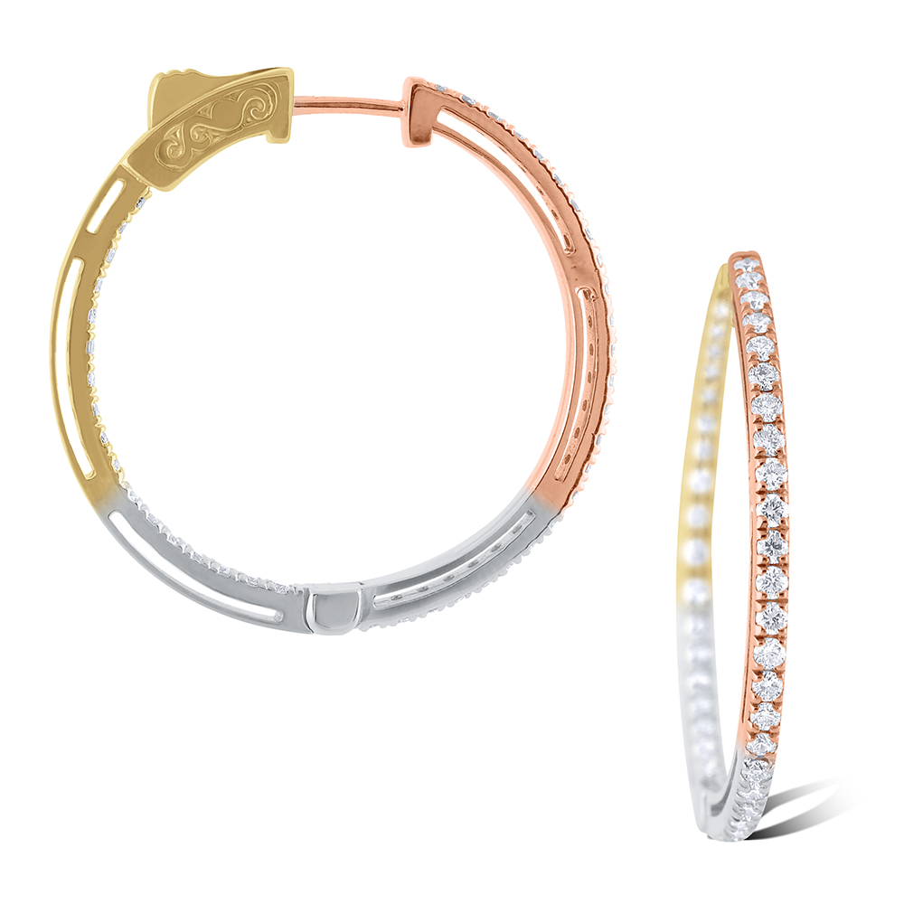 14k yellow, white and rose gold make up these spectacular inside out diamond hoop earrings.