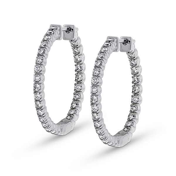 The hottest trend in jewelry fashion right now is hoop earrings and these diamond inside outside hoop earrings glitter with 50 beautiful .50 ct tw diamonds on both sides. This gives them an irresistible sparkle that is absolutely timeless and gives a touch of elegance to your look. They are pictured here in beautiful and classic white gold.