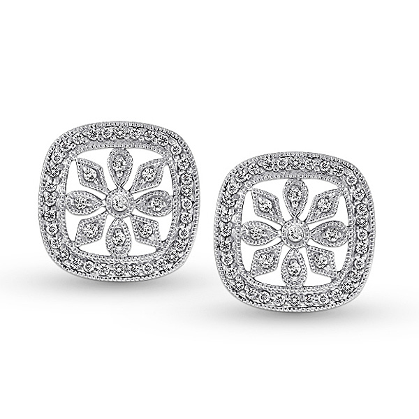 One of the hottest trends right now in jewelry is the move towards vintage and antique styles, capturing the elegance of an era long gone by. These Diamond antique style earrings have an intricate and detailed design that evokes this old fashioned charm. They are festooned with 82 glimmering .38 ct tw diamonds and are pictured in white gold.