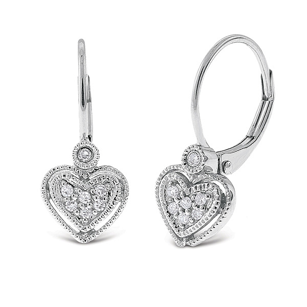 Show off your romantic side with these sweet and elegant diamond heart drop earrings. Husbands and boyfriends take note: these make a charming gift for Valentines Day and unlike flowers, they will never wilt. These earrings sparking with 14 beautiful .09 ct tw diamonds and are shown here in white gold.