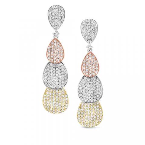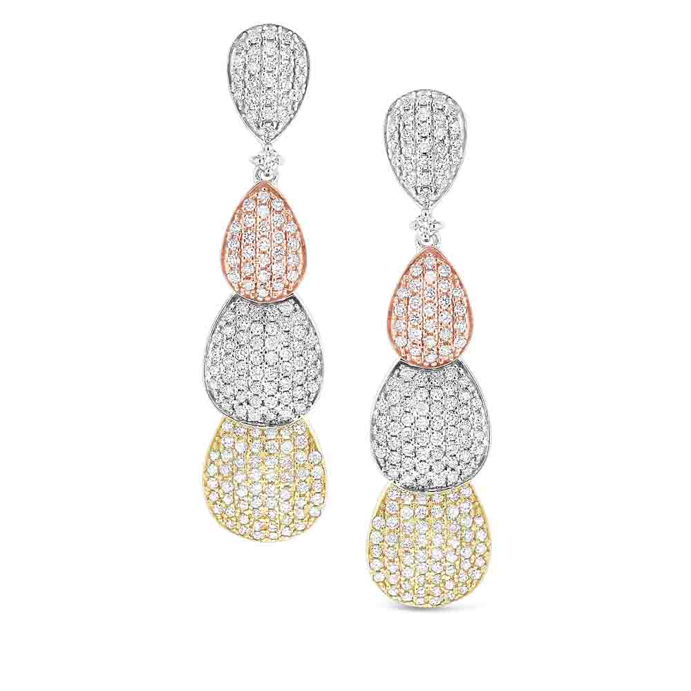 Diamond Triple Pear Drop Earring in 14K White, Rose and Yellow Gold with 338 Diamonds Weighing 2.16ct tw