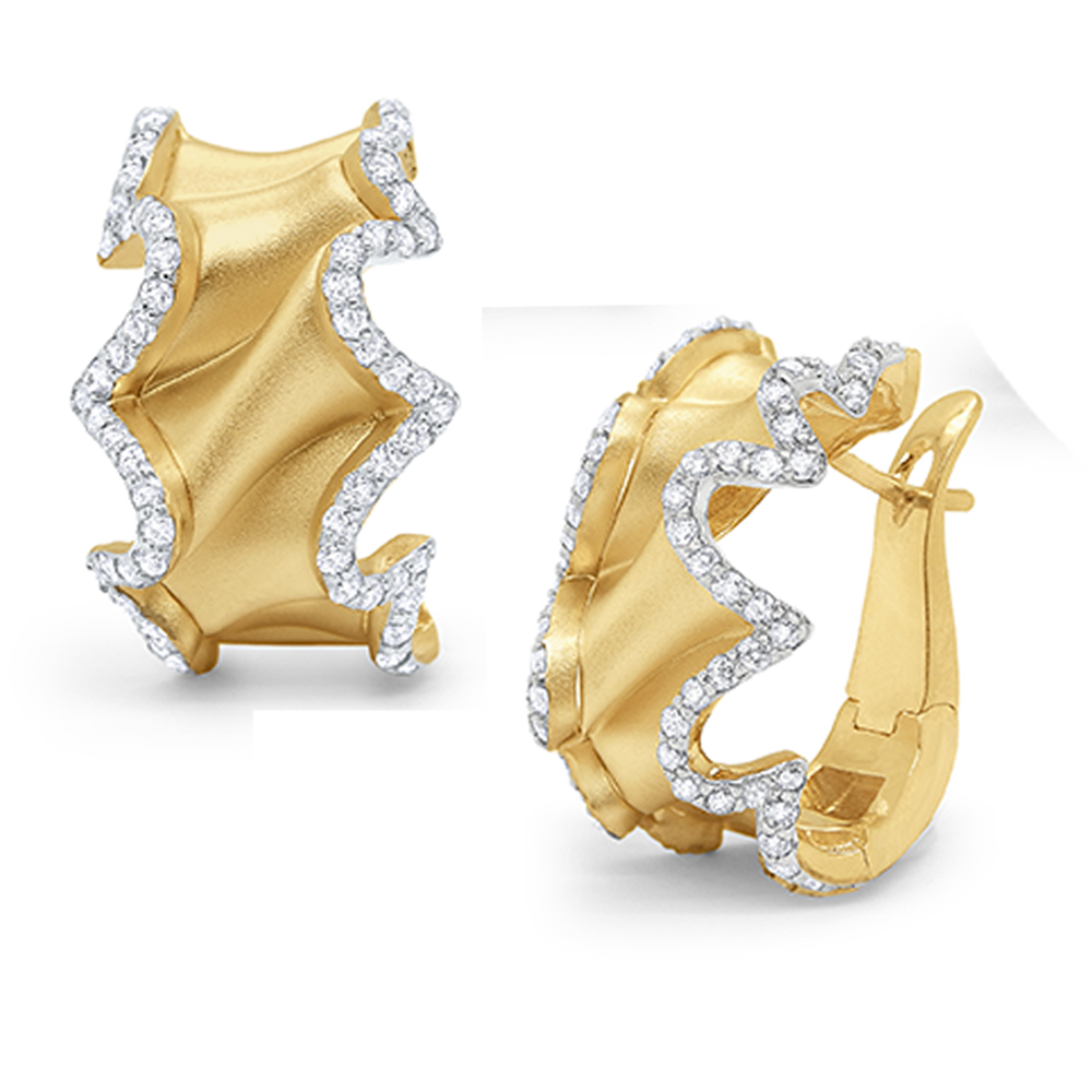 Polished gold accented with diamonds appears to flow like elegant fabric in these modern statement earrings.