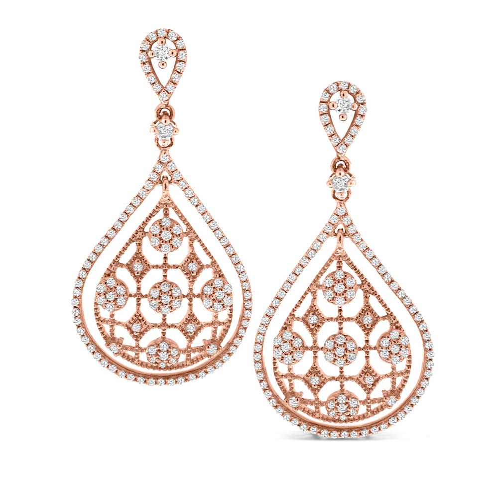 These classic, diamond antique style earrings are bold and instantly recognizable with a design that references the great goldsmiths of the Renaissance. Set in 14K rose gold with 234 dazzling diamonds weighing .94 ct tw, they are as fashionable as they are unique. Wear these stunners and no one will be able to look away.