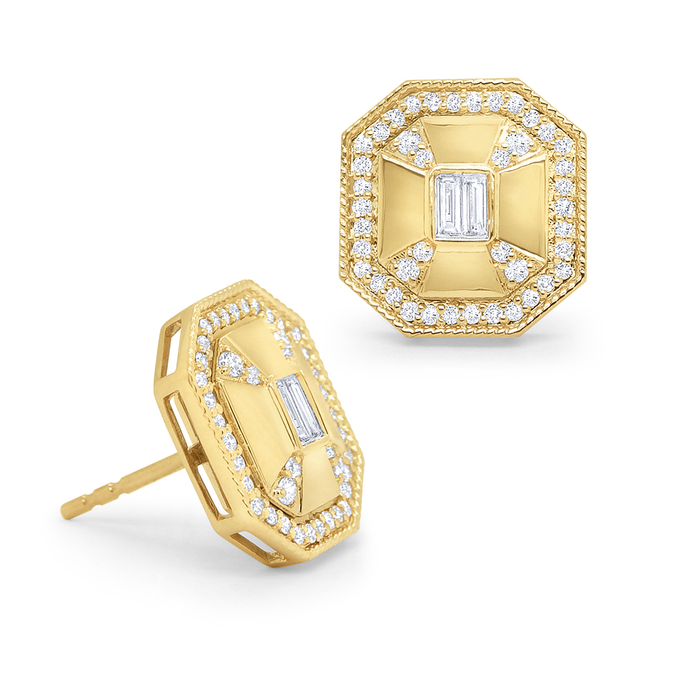 Art deco design is back in fashion. We have the perfect suite to compliment the style in a brushed gold finish. Pictured here are the earrings.