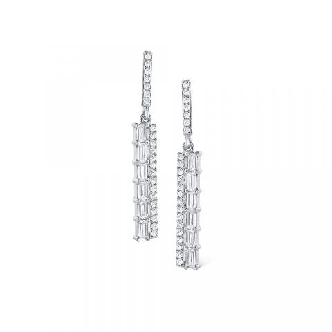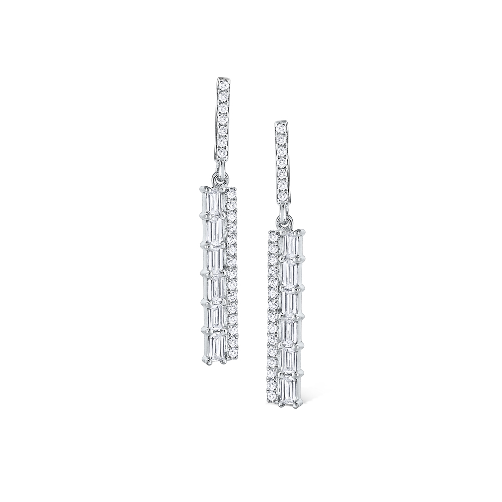 These dramatic drop earrings are created using a collection of baguette and round diamonds aligned in a rectangular linear shape.