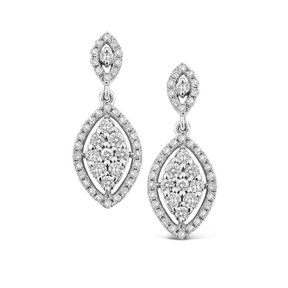 These exquisite diamond marquis shape earrings will add elegance to any gown. Set in 14K white gold with 88 shining diamonds weighing .61 ct tw, these shimmering beauties will dazzle in any setting or circumstance. Dangle these from your ears and revel in the attention you will get.