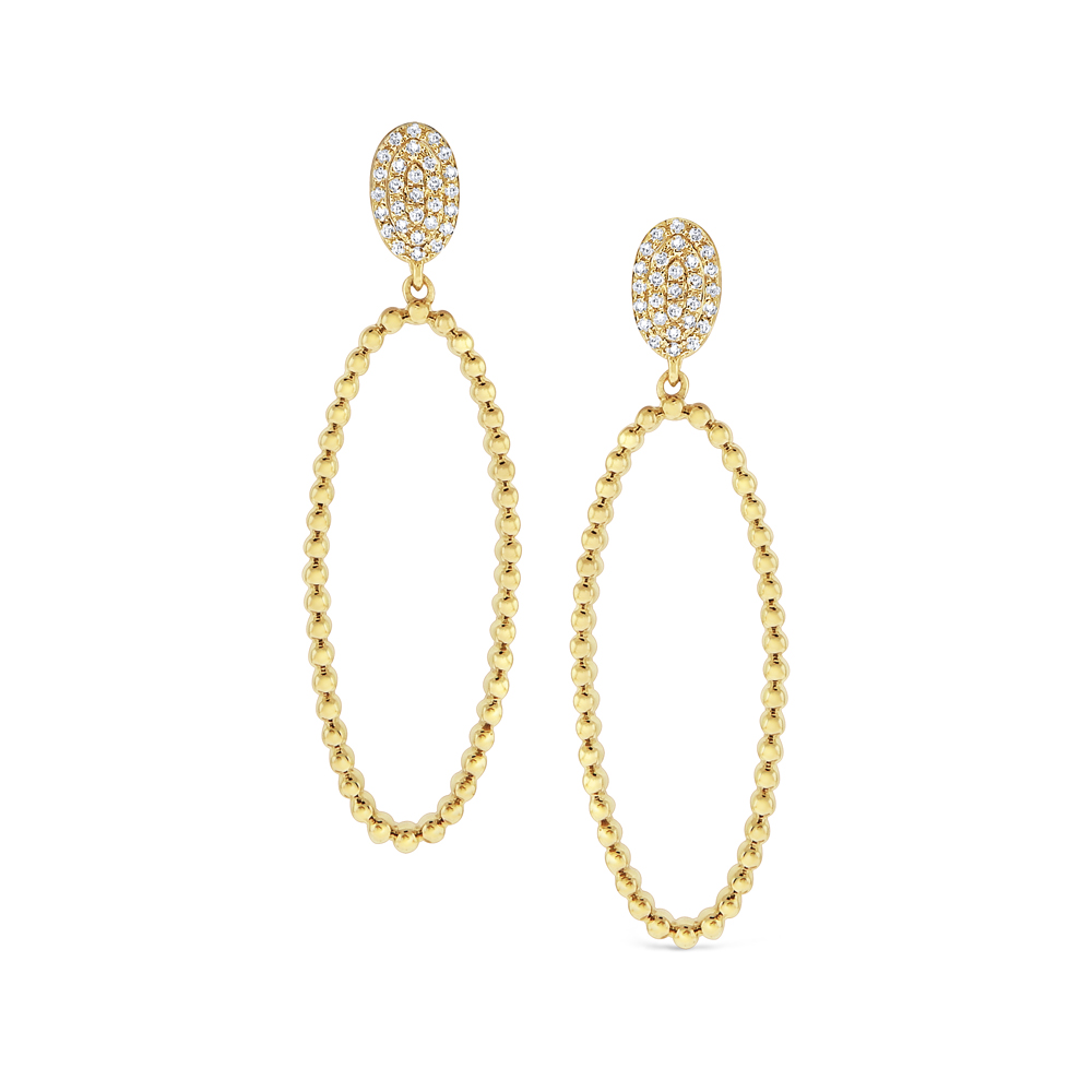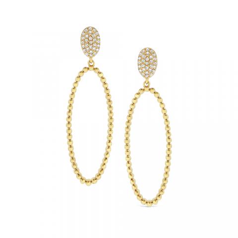 Slender ovals, outlined by tiny caviar beads are anchored by a cluster of sparkling pave diamonds. Shown in yellow gold.