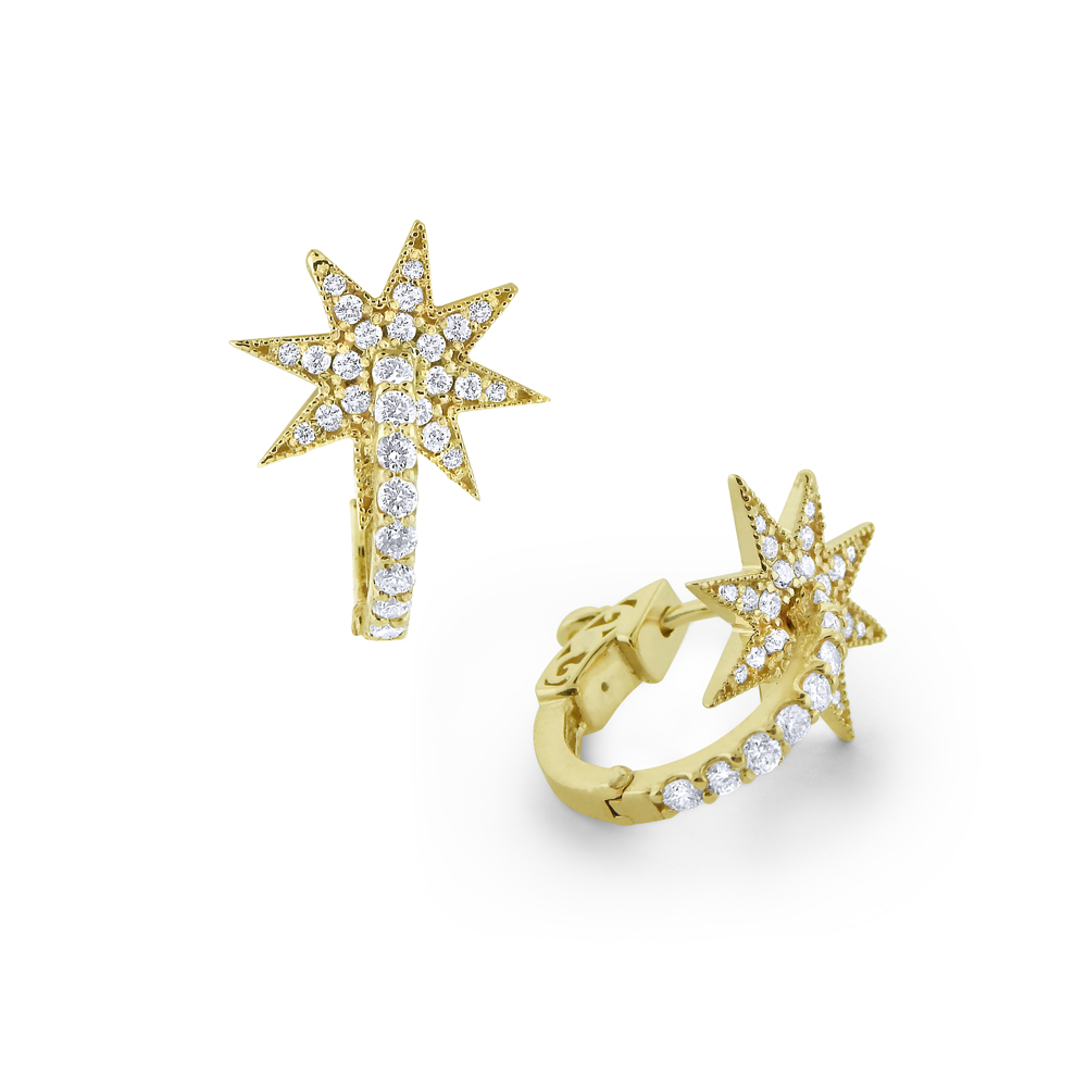 A glistening diamond starburst rests within the setting of this mini diamond hoop for a graceful and feminine look.
