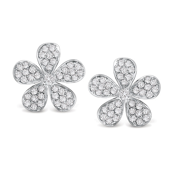 Flowers are Mother Nature's jewelry, but these glittering flowers will never wilt and will bloom for all time. These diamond floral earrings are studded with an array of 82 twinkling .43 ct tw diamonds, giving them an irresistible intricacy to contrast their playful and simple shape. The are pictured here in white gold.