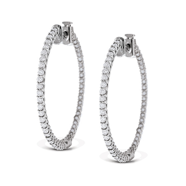 Sometimes a little bit of glamour and sophistication can make a big difference. These diamond inside outside hoop earrings glitter with the twinkling light from 98 stunning 1.85 ct tw diamonds and are pictured here in white gold. They are the perfect accessory for when you want to add a little bit of glitz and elegance to your look.