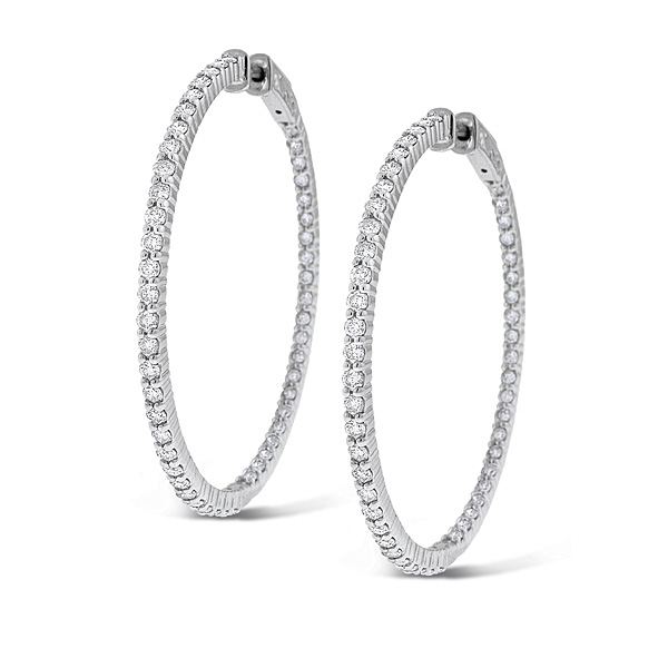 Make a bold statement with these glittering works of art. These stunning diamond inside outside hoop earrings contain 100 twinkling diamonds on the inside and the outside of the band, with a carat total weight of 2.55. They are shown here in white gold and they truly made a big impression, shimmering and shining all night long like a pair of twinkling stars.
