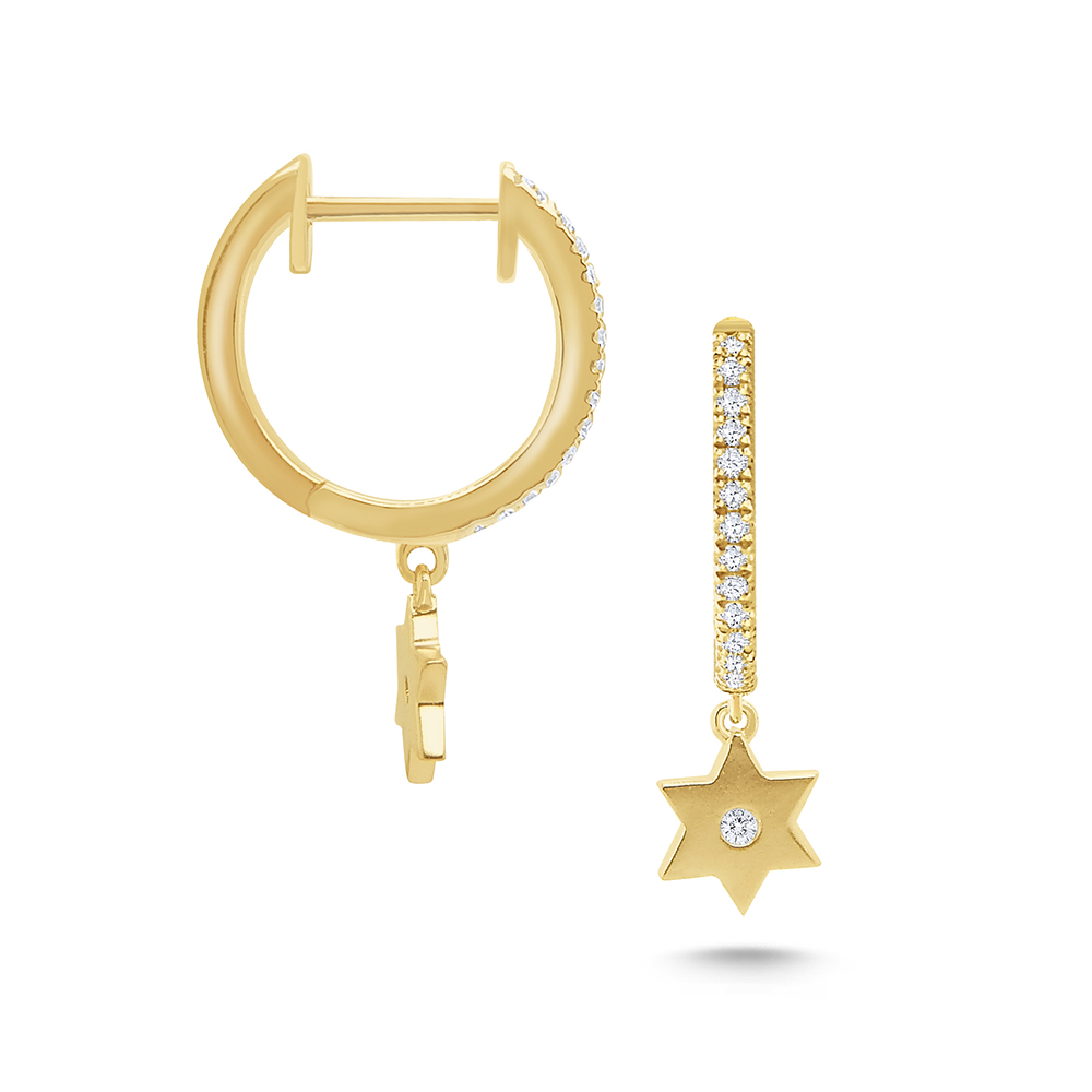 Small golden Jewish Stars dangle delicately below diamond huggie hoops.
