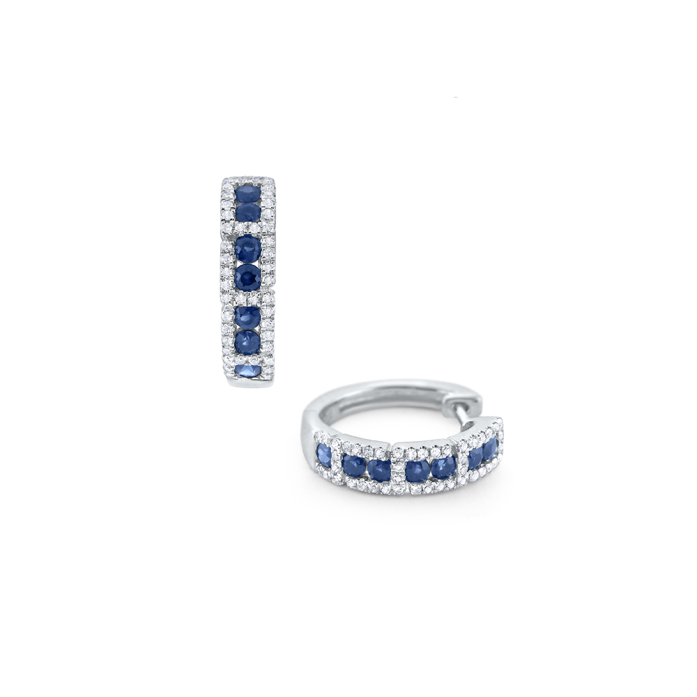 Blue Sapphire & Diamond Mini Hoop Earrings Set in 14 Kt. Gold
