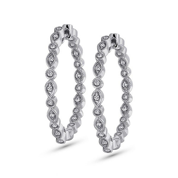 These dramatic diamond inside outside hoop earrings are a unique and creative take on the hoop earring trend, with 42 shimmering and multifaceted diamonds with a total carat weight of .34 around the inside and outside of the hoops. They are pictured here in white gold and they are a superb statement for the chic fashionista.