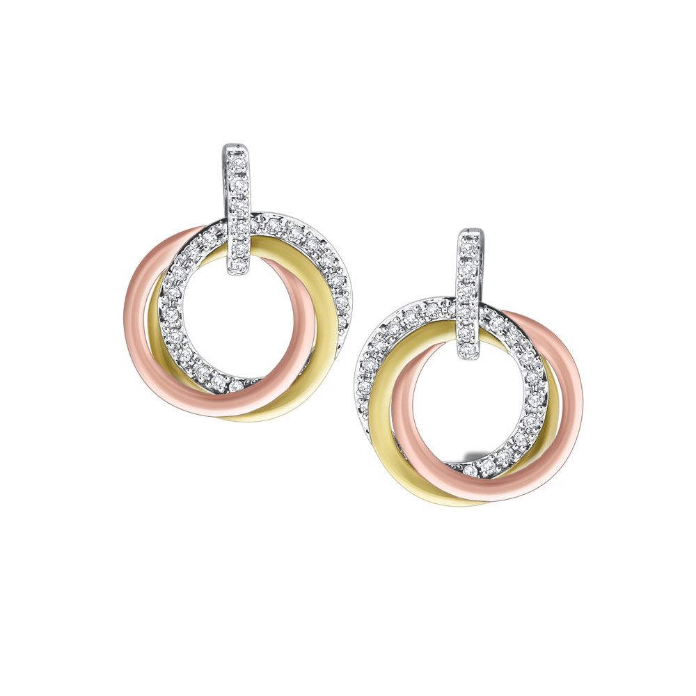 14K modern tri-color gold earrings beautifully accented with diamonds.