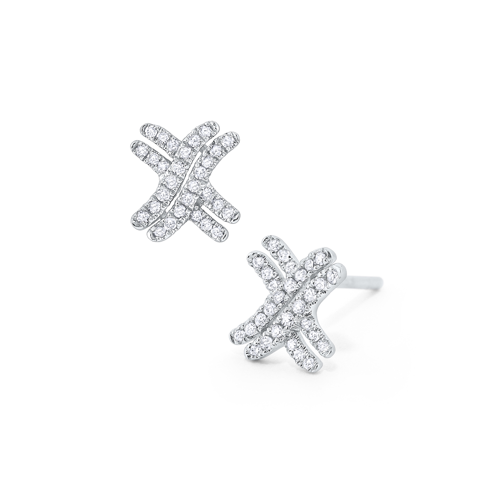 Sparkling round brilliant diamonds are arranges in a fun, wavy “X” shape. These earrings are the perfect, subtle accessory that can be worn with anything.