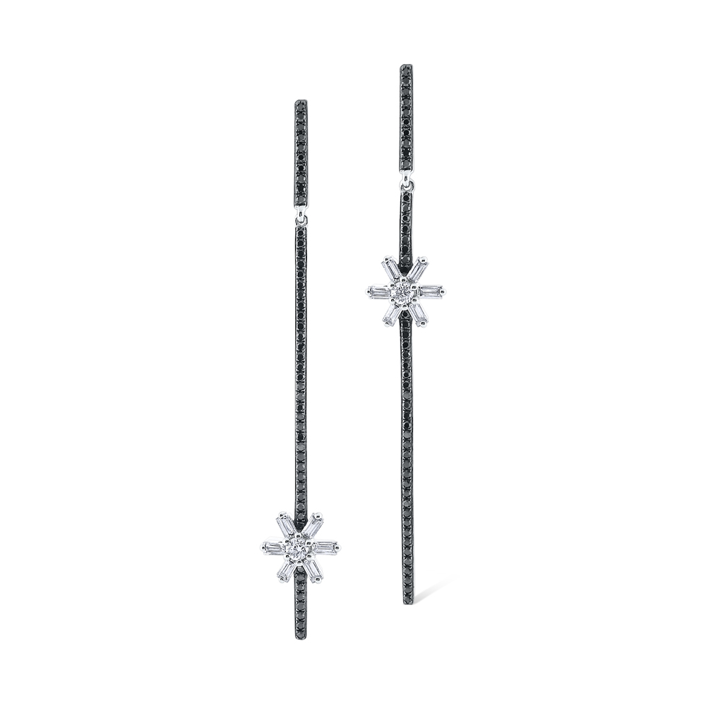 Feel like a shining star in these chic, asymmetrical earrings. Featured in KC Designs Mosaic Collection, round brilliant black diamonds hang in a line from your ear and are interrupted by sparkling white diamond stars in this playful yet elegant design.
