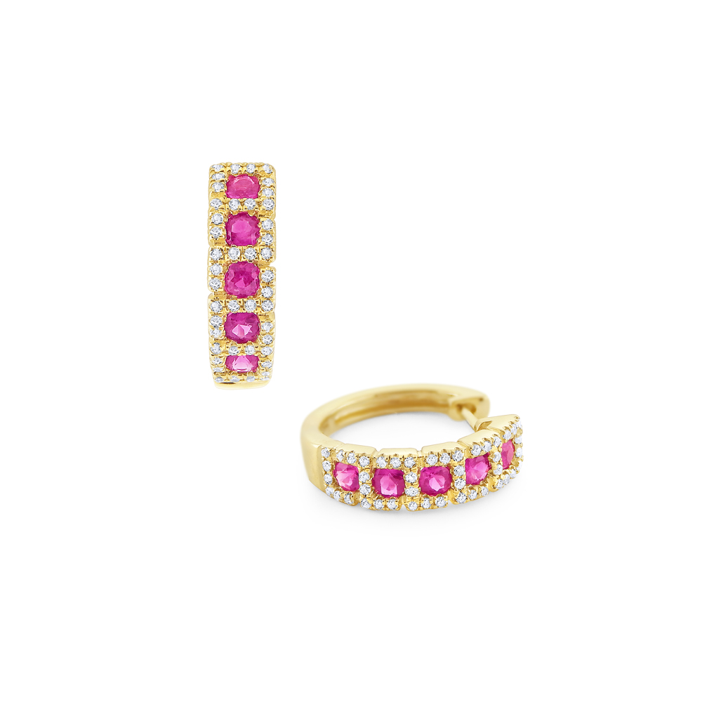 Pink Sapphire & Diamond Mini Hoop Earrings Set in 14 Kt. Gold