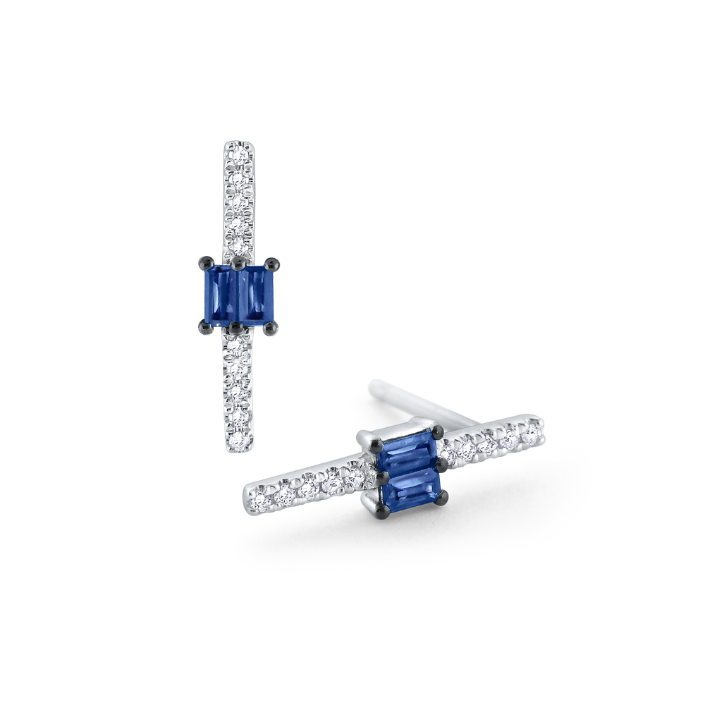 Two sparkling baguette cut sapphires & round brilliant diamonds add a flash of cerulean blue to your ear. Part of KC Designs Everyday Color Collection, these trendy line earrings will make the perfect addition to your collection.