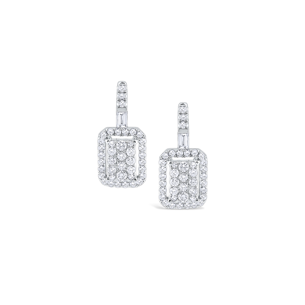 Are you looking for the prefect pop of sparkle? These chic and understated earrings go with any look or hairstyle. Shining round diamonds frame pavé set diamonds in a charming rectangular shape.